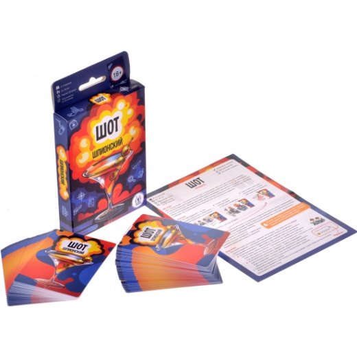 "Шот Шпионский" – это карточная настольная игра с заданиями, в которую обязательно нужно играть с бокальчиком чего-нибудь крепкого. Вообще, с шотом, если отталкиваться от названия игры, но кто ж знает ваши объёмы?! Правила очень простые и объясняются буквально за считанные секунды: в свой ход вы либо выполняете задание, либо пьёте. Других действий нет! Вернее, действий в игре полным-полно, а надо оно вам или нет, решайте сами. Игра идёт до тех пор, пока из колоды не будет вытащена карта "Миссия выполнена", а победу одерживает самый успешный шпион, выполнивший больше всех миссий (для этого всё же придётся подвигаться).
