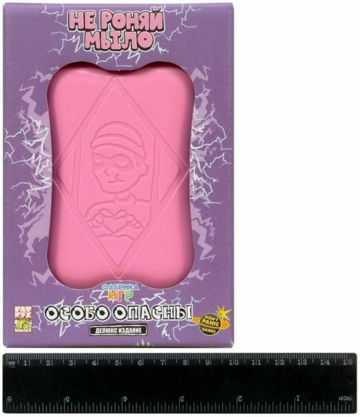 Набор содержит пластиковую мыльницу для удобной переноски игры, базовую версию "Не роняй мыло", а также первое дополнение "Особо опасны".