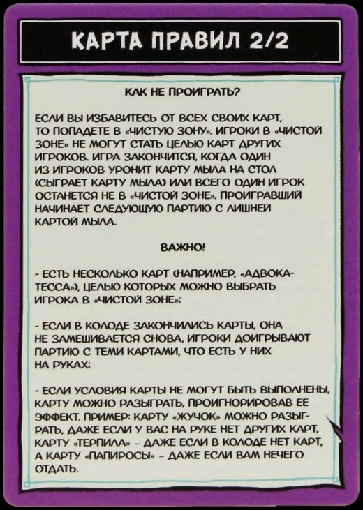 Самое рискованное дело в очередной ходке за решетку – не пахана разозлить, а мыло в душевой уронить! Именно этого вам ни в коем случае нельзя допустить в игре «Не роняй мыло!». Все, что надо делать – каждый ход играть одну-единственную карту. Но горе вам, если, кроме мыла, бросать на стол больше нечего. Ведь в этой игре будет только один проигравший…