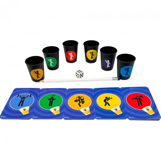 В состав игры входят: 6 шт. рюмки для алкоголя, 44 игровые карты, 12 карт "Это кто..?", игровое поле 320х480 - 1 шт., 1 шт. игровая кость, 1 шт. карандаш, 1 шт. палец указатель