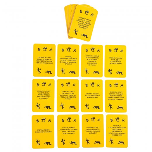 Играть очень просто! Выбирай карточку из своей колоды и со словами «Спорим, я справлюсь?» клади её на стол. Остальные игроки делают ставки на то, удастся ли тебе осуществить задание или нет. Выполнил? Молодец! Забирай все ставки других игроков! А если нет, то каждому отдаёшь по жетону и, конечно, пьёшь штрафную!