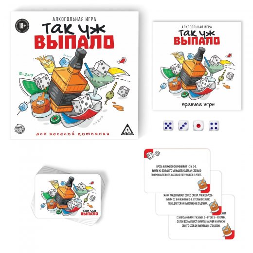 Встретились как-то желание выпить, случайность и хорошее настроение. И что вы думаете? Получилась эта игра! Здесь вам предстоит выполнять задания. А как вы будете это делать, решит бросок кубиков. Если вы справились с заданием – это хорошо. Если нет – придется выпить. А это ещё лучше! Поэтому скорее собирайте друзей и начинайте веселье.