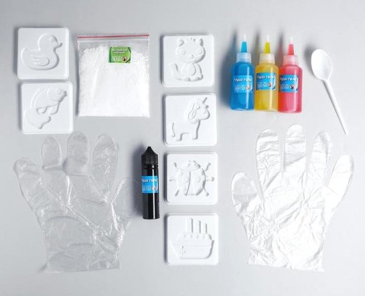 Состав набора: волшебный порошок, чудо-гель, формочки для фигурок, пластиковая ложка, перчатки.