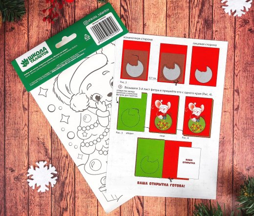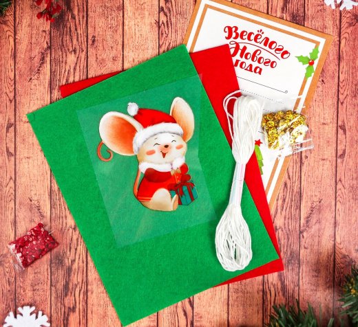 Состав набора: прозрачная основа, фетр, нити, пайетки, термопринт, вкладка для открытки.