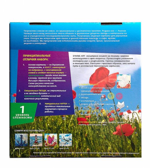 Комплектация: холст с напечатанной схемой, натянутый на подрамник, гвозди, цветные нитки, инструкция