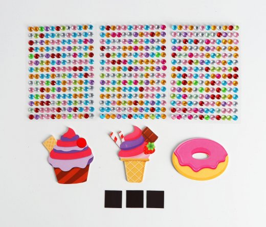 Состав набора: 3 формы для магнита с яркими красочными рисунками, 3 листа со стразами на липком слое, магнитная лента с липким слоем для трёх основ.