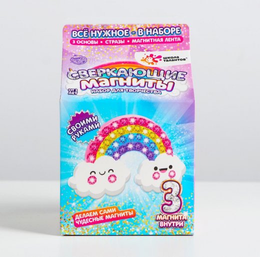 Состав набора: 3 формы для магнита с яркими красочными рисунками, 3 листа со стразами на липком слое, магнитная лента с липким слоем для трёх основ.