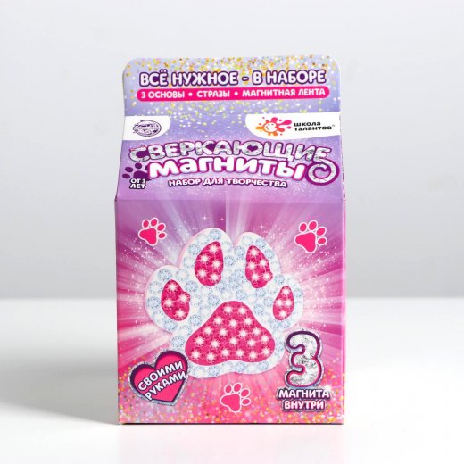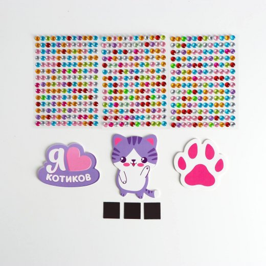 Состав набора: 3 формы для магнита с яркими красочными рисунками, 3 листа со стразами на липком слое, магнитная лента с липким слоем для трёх основ.
