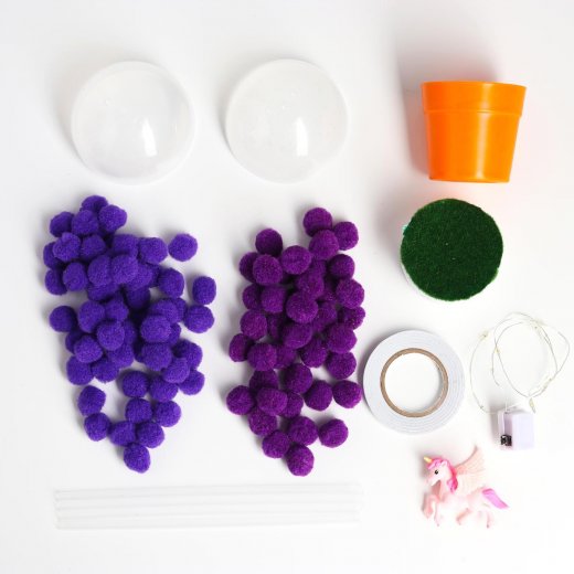 С набором для творчества «Воздушный шар: Пегас» получится замечательная поделка, которая увлечёт и детей, и взрослых. Поместите светодиод в пластиковый шар и аккуратно закройте две половинки. Проверьте, чтобы диод работал. Вставьте трубочки одним концом в ведерко с наполнителем и зафиксируйте их там клейкой лентой, если необходимо. С помощью клейкой ленты приклейте трубочки к шарику. Провод от светодиода опустите вниз и приклейте с одной из сторон ведерка. Украсьте пластиковый шар мягкими помпонами, приклеивая их на клейкую ленту.