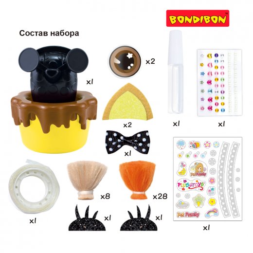 Внутри Вас ждет все, что нужно для создания милой игрушки: основа, глаза, реснички, ушки, бабочка, кисточки, клей, скотч и наклейки.