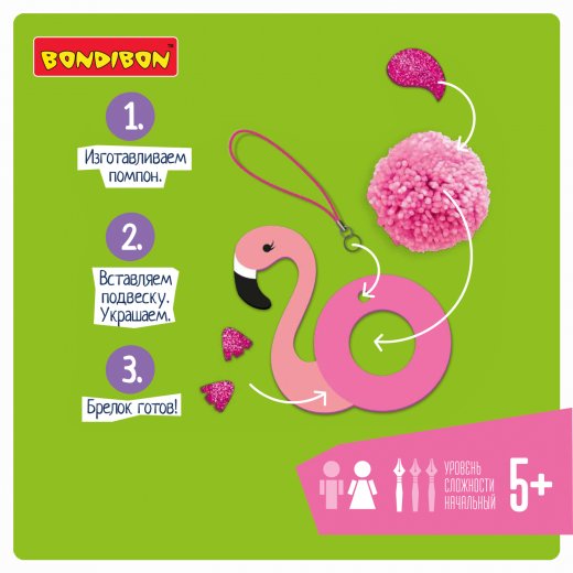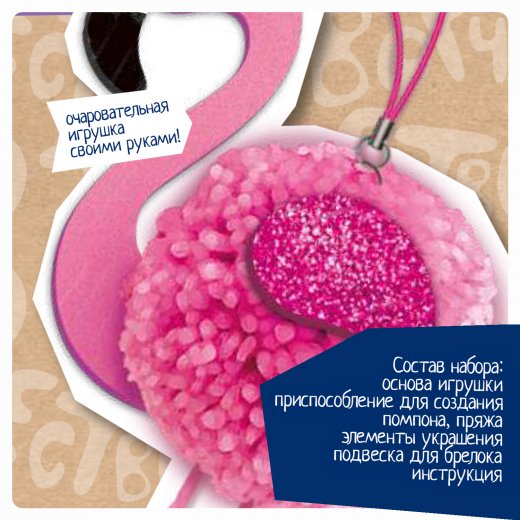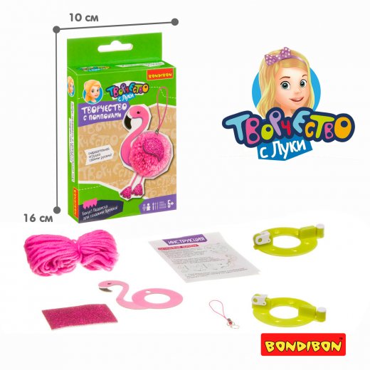 Впервые получив серьёзное распространение во Франции, помпоны продолжают своё победное шествие по миру. Если раньше их использовали в качестве украшений одежды или военных знаков отличия, то сегодня им находят применение в самых разных сферах, например при воспитании и обучении детей. Из помпонов довольно легко изготовить яркую игрушку, а дальше её можно использовать как в образовательном процессе, так и для игры. BONDIBON предлагает вам прикоснуться к этому удивительному миру с помощью серии Творчество с помпонами! Смастерите изящного фламинго, который станет прекрасным украшением портфеля или телефона, ведь в комплекте есть подвеска. Также в наборе: прочный пластиковый станок для вязания помпонов, пряжа, элементы украшения, подвеска для брелока, инструкция.