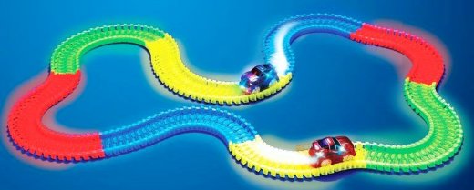 Magic Tracks является совершенно новым и необычным светящимся гоночным треком. Такого изгиба гоночной трассы и необыкновенного свечения в темноте Вы никогда не видели! Вы можете изогнуть трассу на 360 градусов. Просто соедините кусочки трека вместе, и вы получаете полностью настроенную трассу своего собственного творения. А еще лучше, когда вы выключаете свет и погружаетесь в магию Magic Tracks!