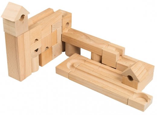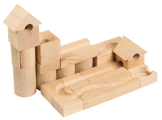 Конструктор деревянный Шарики-кубарики для самых маленьких Стартовый – отличается от всех прочих наборов этой серии тем, что детали в ней - разной формы (треугольные крыши, цилиндрики, прямоугольные блоки и т.д.) Это поможет разнообразить игру, а также позволит использовать конструктор как классический строительный набор.