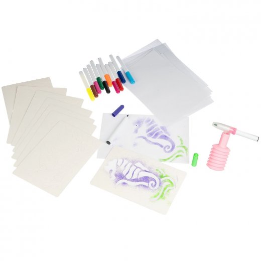 Дети любят рисовать дующими фломастерами, потому что это легко! Сделай потрясающие картинки с аэрографическим эффектом, используя трафареты и фломастеры из набора. Положи трафарет на бумагу, выбери и распыли первый цвет, надев на фломастер распылитель, выбери и распыли остальные понравившиеся тебе цвета, сними распылитель с фломастера и дорисуй необходимые детали без него. Внутренняя вставка в коробке является подставкой для фломастеров.