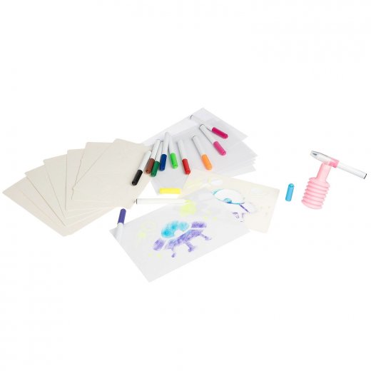 Дети любят рисовать дующими фломастерами, потому что это легко! Сделай потрясающие картинки с аэрографическим эффектом, используя трафареты и фломастеры из набора. Положи трафарет на бумагу, выбери и распыли первый цвет, надев на фломастер распылитель, выбери и распыли остальные понравившиеся тебе цвета, сними распылитель с фломастера и дорисуй необходимые детали без него. Внутренняя вставка в коробке является подставкой для фломастеров.