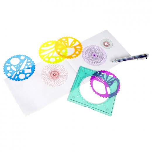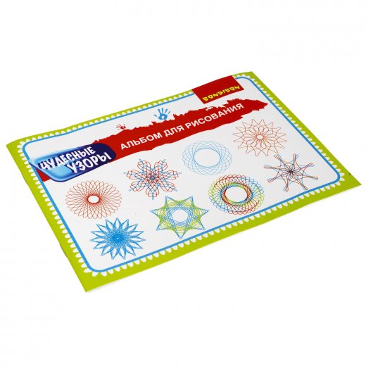 В комплекте: спирограф, 4 фигурных вкладыша, альбом для рисования и разноцветная ручка.
