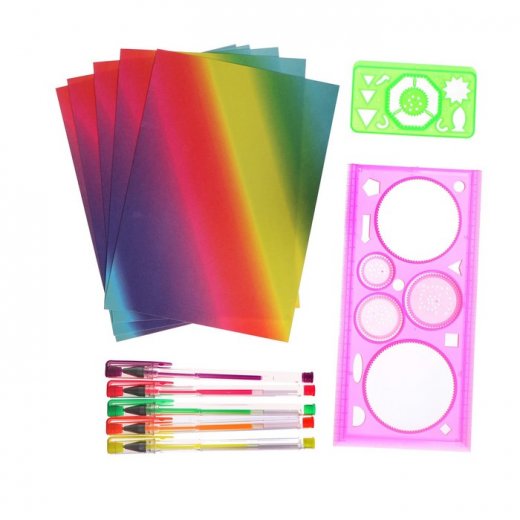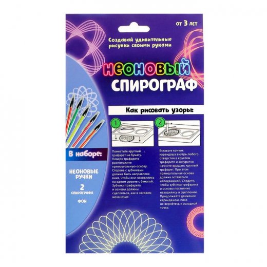 В набор входят 2 спирографа, фон, 5 неоновых ручек.