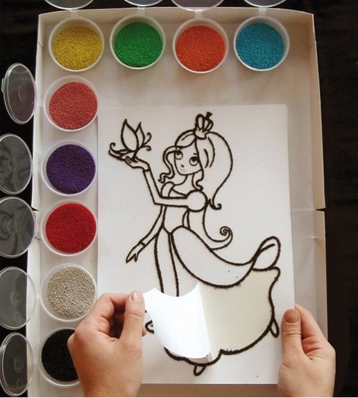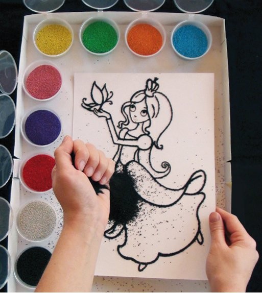 9. ребенок может использовать оставшийся цветной песок, с помощью клея ПВА или двойного скотча создавая другие разнообразные поделки (декорировать посуду, оформлять открытки и т.д.) и открывая для себя новые возможности для творчества;