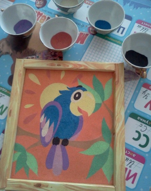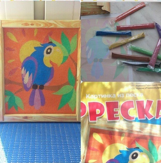 При помощи данного набора вы сможете создать замечательную картину из песка. При выборе цветовой гаммы для картинки можете ориентироваться на рисунок, изображенный на упаковке. Снимайте с каждого элемента верхний защитный слой и засыпайте его песком выбранного цвета. Готовую картинку можно вставить в рамку. Отличное занятие для детей. Развивает фантазию, координацию и мелкую моторику рук.