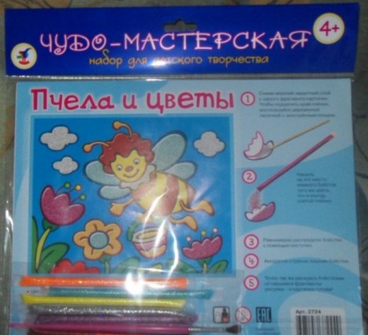 Состав набора: цветная основа с контуром рисунка и клеевым слоем, 6 пакетиков цветных блесток, кисточка, деревянная палочка.