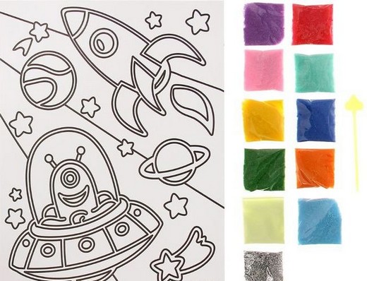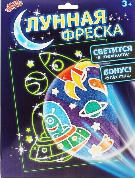 В наборе: фреска? клеевая основа, 9 цветов песка по 10г, светящийся песок 3г, блестки, стек.