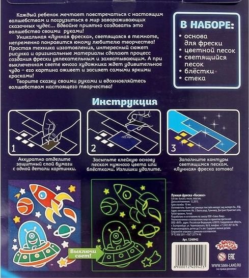 Ваш ребёнок самостоятельно украсит фреску песком и блёстками. Такой шедевр станет отличным подарком! Самое удивительное? картина светится в темноте! Подержите её несколько минут у лампы, а затем гасите свет! В темноте юного художника ждёт удивительное чудо: его картина оживёт и засияет самыми яркими красками! Простая техника изготовления, необычные материалы сделают творческий процесс весёлым и увлекательным. Чем полезно? При работе с набором у ребёнка развивается мелкая моторика и координация движений, формируются очень важные качества, которые непременно пригодятся ему в будущем: усидчивость, аккуратность, внимательность, зрительное восприятие и художественный вкус. Как работать с набором? Необходимо отделить защитный слой с одной детали картинки и засыпать основу песком нужного цвета либо украсить блёстками, удалить излишки. Затем заполнить контуры светящимся песком. Так шаг за шагом малыш создаст удивительный шедевр.