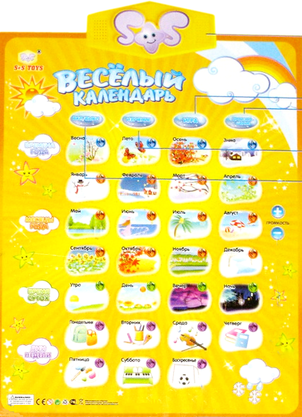 Электронный плакат Веселый календарь – поможет расширить кругозор ребенка и познакомит его с множеством интересной информации. На нем нарисованы картинки, соответствующие временам года, месяцам, времени суток и дням недели и есть кнопки, нажав на которые, можно это все воспроизвести. Плакат работает в 3 режимах: изучение (названия озвучивается без описаний и объяснений), произношение (слова произносятся по буквам) и игра (ребенку читается стих с вопросом, на которой нужно выбрать ответ). Модель защищена от воздействия влаги и оборудована функциями регулировки громкости и автоматического отключения после 15 секунд бездействия, на случай если ребенок забудет отключить плакат по завершению игры.