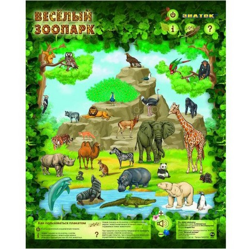 Звуковой плакат Веселый зоопарк Знаток – в легкой игровой форме познакомит вашего малыша с дикими животными и птицами, как экзотическими, так и обитающими в нашей средней полосе. Нажимая на сенсорные кнопки, ребенок услышит их названия, голос и узнает, какую пользу они приносят человеку. Акцент сделан на самостоятельное обучение, когда ребенок сам определяет продолжительность и сложность урока, а также в любой момент может проверить себя. На плакате изображены: Сова, дятел, орел, попугай, чайка, павлин, белка, волк, лиса, мартышка, горилла, лев, тигр, слон, жираф, зебра, верблюд, бегемот, носорог, кенгуру, олень, панда, дикобраз, кобра, крокодил, лягушка, дельфин, тюлень, белый медведь, пингвин.