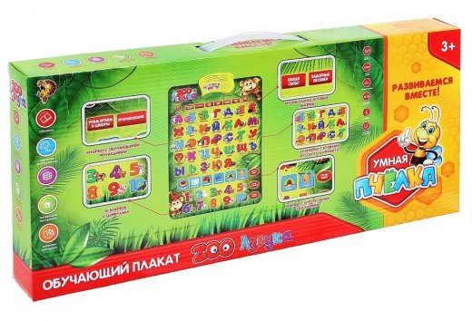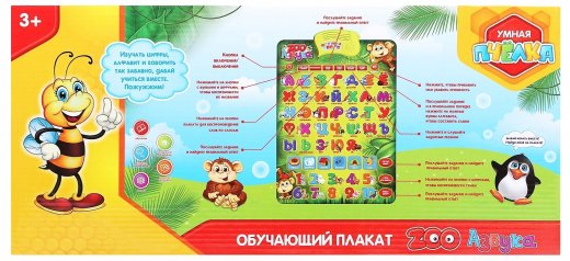 Вместе с этой увлекательной игрушкой чадо изучит цифры, алфавит, разовьёт память, воображение, логику, визуальное и слуховое восприятие, моторику рук, весело и с пользой проведёт время. Обучающий электронный плакат «ZOO Азбука» станет родителям хорошим помощником, а для крохи - источником знаний, учителем и другом!