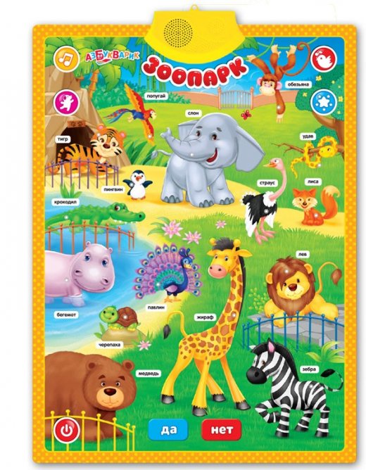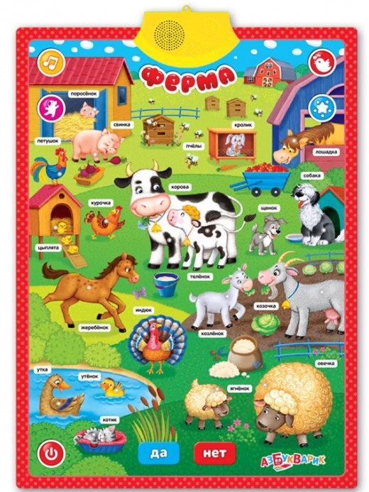 Плакат Ферма и зоопарк –это двусторонний говорящий плакат, который станет незаменимым помощником родителей! 40 зверюшек фермы и леса, 130 вопросов и загадок, 10 песенок – всё это поможет провести время и весело, и с пользой! Дети узнают много нового и интересного о животных и проверят свои знания с помощью умных игр: «Да – нет», «Угадайка», «Загадки». Плакат можно повесить на стену любой стороной или играть с ним, где будет удобнее.