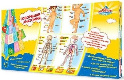 Говорящий плакат Анатомия – познакомит ребенка со строением тела человека, расскажет о том, какая пища полезна и почему. Плакат разделен на 4 части: на первой можно познакомиться с названием частей тела; на второй — с названием мышц; на третьей — с названиями основных костей; на четвертой — с внутренними органами (при нажатии на кнопки звучит название соответствующего органа и дается краткая информация, для чего он нужен). Исследовав этот плакат, ребенок узнает: какие есть части тела, мышцы, кости, внутренние органы; назначение кровеносной системы; сколько мышц в человеческом теле; для чего нам нужны белки, жиры и углеводы.