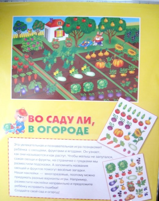 Плакат игра Во саду ли, в огороде – это увлекательная и познавательная игра, которая познакомит ребенка с овощами, фруктами и ягодами. Он узнает, как они называются и как растут. Чтобы малыш не запутался, сажая овощи и фрукты, на страничке с грядками мы разместили подсказки. А запомнить названия овощей и фруктов помогут веселые загадки. Наклейки - многоразовые, поэтому можно придумать разные варианты игры. Например, разместите наклейки неправильно и предложите ребенку исправить ошибки! Создайте свой сад и огород! Плакат и наклейки очень яркие и красочные, поэтому без труда привлекут внимание ребенка и увлекут в игру.