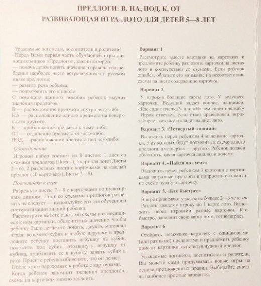 Представленный материал идеально подходит для обучения в игровой форме, что способствует лучшему запоминанию и усвоению материала. В руководстве, прилагаемом к пособию, подробно описаны виды игр в простом и усложненном виде. Красочные, забавные рисунки привлекут внимание ребенка, а простые схемы объяснят грамматические правила. Вы сможете подобрать подходящий для Вашего ребенка и создать новые игры на основе предложенных. В комплект входит описание разных вариантов игр и восемь листов А4 на картоне (со схемами предлогов, картами лото, разрезными карточками).