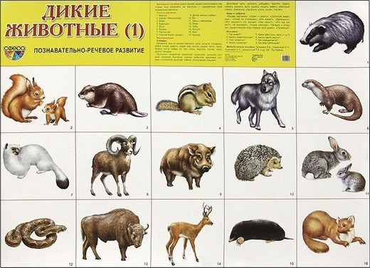 Демонстрационные карточки Познавательное и речевое развитие Дикие животные – это универсальное наглядное пособие. Его можно использовать на любых занятиях, в играх, самостоятельной деятельности детей. К каждой предметной картинке прилагаются: описание, стихотворение, загадка, вопросы, написание слова на русском и английском языках. Карточки в наборе: горный баран, барсук, белка, змея и т.д. По таким карточкам можно составлять рассказы или попросить ребенка классифицировать животных по величине, по форме, способу передвижения, или по способу питания и т.д. В общем игр можно придумать огромное множество. Карточки очень яркие и красочные, поэтому без труда привлекут внимание детей. Кроме того дети узнают много подробностей о животных – в наборе имеются довольно подробные описания и прочая интересная информация.