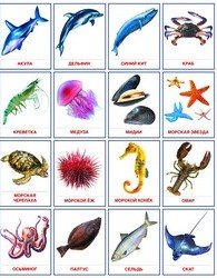Демонстрационные карточки Познавательное и речевое развитие Мир морей и океанов – помогут взрослым организовать интересные игры с ребятами, в процессе которых они смогут познакомиться с различными обитателями морских глубин: акулой, дельфином, синим китом, крабом, креветкой, медузой, мидией, морской звездой, морской черепахой, морским ежом, морским коньком, омаром, осьминогом, палтусом, сельдью, скатом. Карточки выполнены из мелованного картона. На одной стороне карточки располагается красочное изображение с подписью, выполненной красными чернилами, на другой – название, написанное печатными и прописными буквами. Карточки очень яркие и красочные, поэтому без труда привлекут внимание детей. Кроме того дети многое узнают о морских обитателях – в наборе имеются довольно подробные описания и прочая интересная информация.