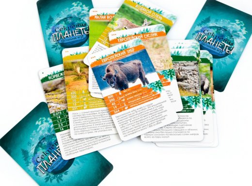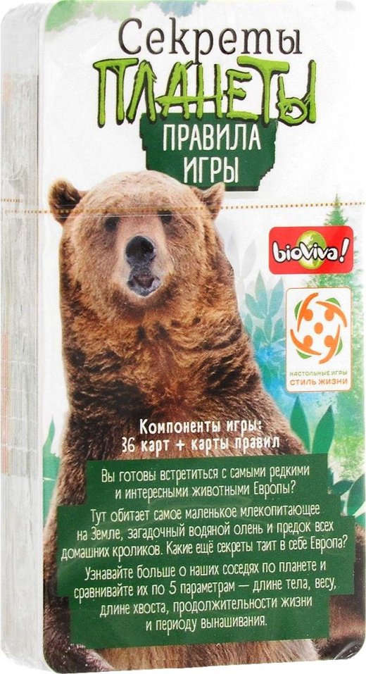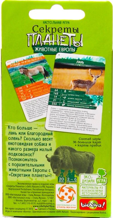 Настольная игра Секреты планеты Животные Европы – предлагает вам узнать большое количество новой информации в игровой форме. В коробке вас ждут 36 карт определенной тематики. Узнавайте больше о наших соседях по планете и сравнивайте их по пяти параметрам – длине тела, весу, длине хвоста, продолжительности жизни и периоду вынашивания. Кто больше – обыкновенный бобр или барсук? Какой длины хвост у пиренейской рыси и сколько живёт норвежский лемминг? В настольной игре Секреты планеты: Животные Европы вы встретитесь с самыми редкими, необычными и удивительными европейскими животными. Тут обитает самое маленькое млекопитающее на Земле, загадочный водяной олень и предок всех домашних кроликов. Какие ещё секреты таит в себе Европа?