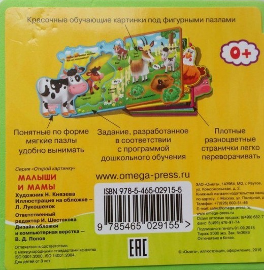 Серия «Книжка с мягкими пазлами» предназначена для интерактивного обучения детей раннего возраста. Предлагаем вашему вниманию книжку с мягкими пазлами с красочными обучающими картинками под фигурными пазлами, с плотными разноцветными страничками, легко переворачивающимися. В книге есть задания, разработанные в соответствии с программой дошкольного обучения, а понятные по форме мягкие пазлы удобно вынимать