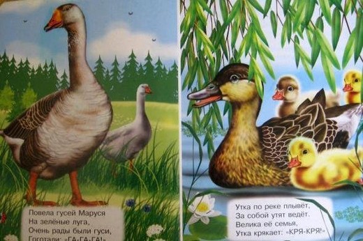 На каждой страничке яркие иллюстрации животных, в стихотворной форме учимся их озвучивать, не просто:" Как говорит корова?", а "Где хозяйка, не пойму, говорит корова "Муууу". Читаем и играем. Эта книжка для самых маленьких. Очень простая и красочная, с весёлыми картинками. В книжке пять разворотов, страницы очень плотные.