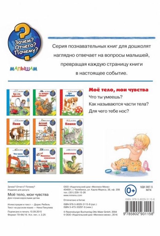 Серия познавательных книг для дошколят наглядно отвечает на вопросы малышей, превращая каждую страницу книги в настоящее событие. Что ты умеешь? Как называются части тела? Для чего тебе нос? Для чтения взрослыми детям.