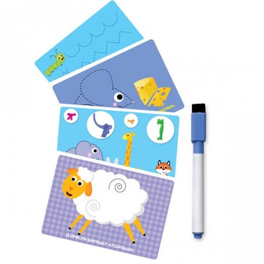 Комплектация: 16 односторонних карточек с заданиями, маркер с губкой.