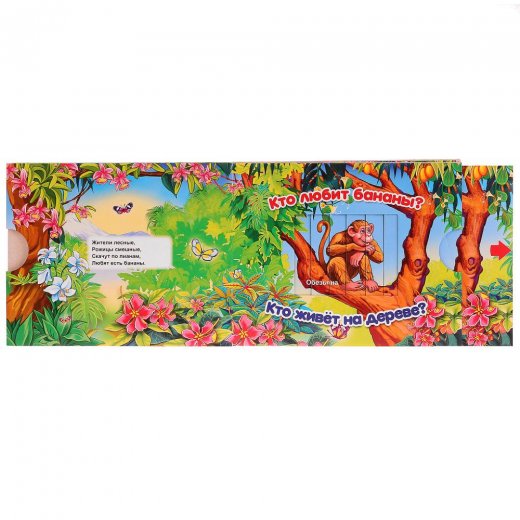Открывая книгу, малыш попадает в зоопарк, где живут приветливые экзотические животные. Чтобы познакомиться с ними поближе, ответьте на вопросы, которые напечатаны на каждом развороте. Например: кто папа у тигрёнка и как он говорит? Кто живет на дереве и любит бананы? Тяните задвижку, и перед вами откроется картинка, иллюстрирующая ответ. Читайте забавные четверостишия и отгадывайте загадки о зверятах.