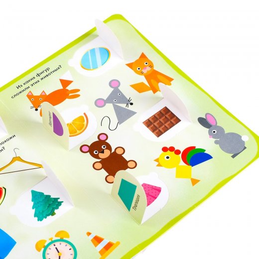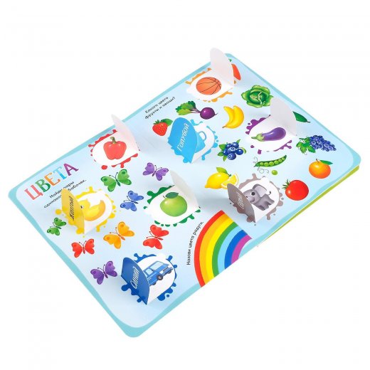 Книга сделана из плотного картона, поэтому прослужит долго. Внутри ребёнок найдёт 32 окошка с яркими изображениями животных, фруктов, овощей и других предметов. Также в книжке есть интересные задания, типа "Найди и покажи". С помощью книги малыш выучит геометрические фигуры и цвета.