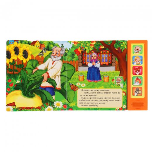 Комплект: музыкальная книжка со сказкой «Репка», 5 звуковых кнопок, красочные иллюстрации.