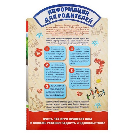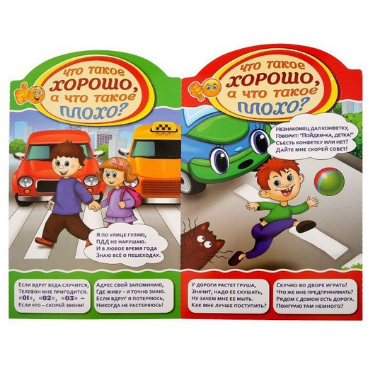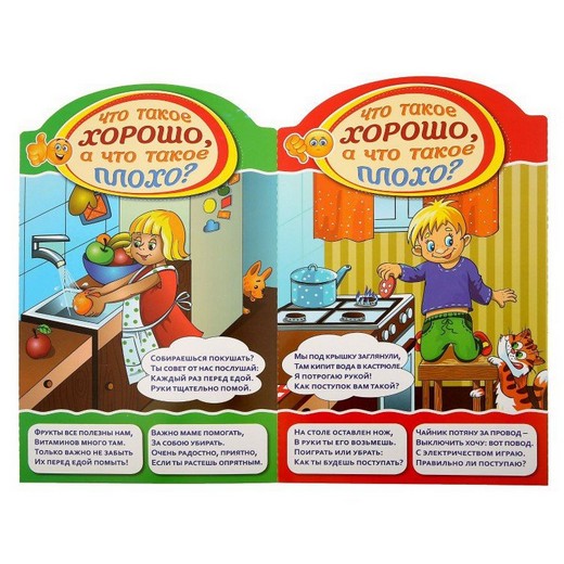 Разверните книжку-раскладушку, и перед вами откроется множество сюжетных зарисовок. На каждой из них изображены дети, которые занимаются тем или иным делом. Под картинками вы найдёте весёлые стихотворения, которые спрашивают, хорошо или плохо поступают герои. Пусть ребёнок рассматривает иллюстрации и описывает, что на них происходит. А после прочитайте ему стихи и спросите, хорошие или плохие поступки описаны в нём. Весело играя, вы научите чадо множеству полезных вещей!