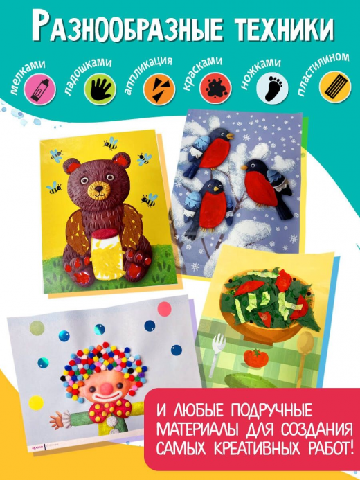 Ваш малыш уже держит карандаш и умеет рисовать каракули? Пора познакомить его с миром творчества научить его рисовать пальчиками, держать кисточку, проводить линии, выполнять простейшие манипуляции с пластилином, делать несложные аппликации. Вы стоите перед выбором какое взять развивающее пособие пальчиковые раскраски, задания по аппликации или рисованию пластилином? В конце концов, вы хотите просто сесть с малышом и погрузиться в творчество, но у вас нет времени придумывать сюжет и подбирать для него материалы! Серия Всё готово к творчеству сборники простых творческих занятий для совместного творчества мамы и малыша, где всё уже придумано для вас! Альбом Листы-шаблоны для творчества. ЖУЖА объединяет все техники для детского творчества в одном пособии.В альбоме 60 листов-шаблонов 40 готовых занятий. Каждое занятие состоит из листа с инструкцией для мамы и арт-листа для малыша. Арт-лист это красочная картинка-заготовка, которую нужно творчески доработать одним из предлагаемых способов. С помощью этого альбома ребёнок создаст свои первые шедевры, а мама получит удовольствие от совместного творчества с малышом. Уникальные преимущества издания:- Хватит надолго! Очень много разных заданий, которые долго не наскучат ребёнку! Все разные, простые и очень интересные. - Все техники для раннего творчества в одном пособии: раскрашивание пластилином и красками, аппликация, рисование пальчиками, восковым мелком, отпечатками ручек и ножек выберите, какая понравится вашему ребёнку больше остальных.- Очень большой формат (больше, чем А4). Все рисунки и детали крупные и удобные для малышей.- Подходит для самых маленьких. Даже для тех, кто ещё не умеет держать карандаш. Для годовалых младенцев листы с заданиями для отпечатков ножек и ладошек.- Каждый лист запечатан только с одной стороны и легко отрывается от блока. Малышу легче рисовать не в книге, а на отдельном листе. Готовую работу легко просушить можно не опасаться склеивания с другими листами.- Для подарков и поделок в детский сад. На каждом арт-листе есть место для подписи имени и возраста маленького художника готовые работы малыша можно дарить родным и друзьям, относить в детский сад на конкурс поделок или никому не отдавать, а повесить такую красоту на стену!