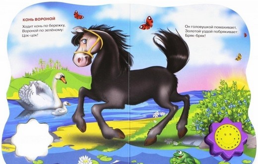 Книжки серии "Волшебная кнопочка" обязательно придутся по вкусу вашему малышу. Книжка-потешки для самых маленьких с интересными, красочными рисунками и забавными напевными песенками понравится малышам. В это издание входят одни из самых распространенных песенок-потешек народного творчества - "Сорока белобока" и "Конь вороной", на которых выросло не одно поколение детей. Страницы выполнены из плотного картона, не отрываются и не мнутся. Звуковой модуль изготовлен в виде звездочки из яркого и качественного пластика, без острых углов и шероховатостей.