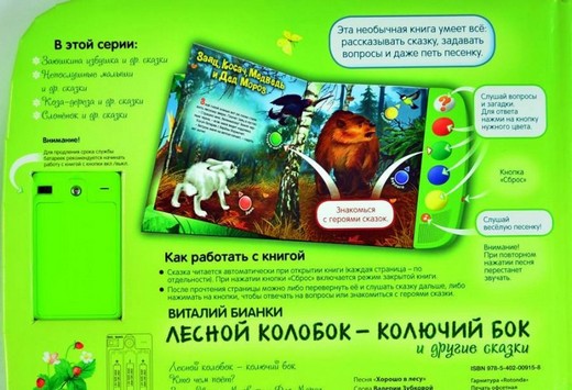 В книге собраны три популярные сказки В. Бианки для малышей. Умная говорящая книжка сама читает по ролям, поёт песенку, задаёт вопросы по тексту и хвалит за правильные ответы! Кнопка с вопросительным знаком переключает модуль в режим "Вопрос – ответ".