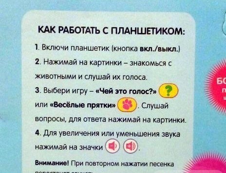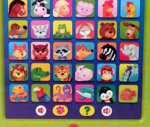 В нижней части планшета находятся кнопки выбора одного из двух режимов "Чей это голос?" и "Веселые прятки". Планшет задаст ребенку вопросы, для ответа на которых малышу нужно нажимать на кнопочки с животными. При нажатии на музыкальную кнопку кроха прослушает одну из пяти песенок из советских мультфильмов. При повторном нажатии на кнопочку песенка перестает звучать. Под панелью выбора режимов находятся кнопки регулировки громкости, а еще ниже - кнопка включения/выключения.