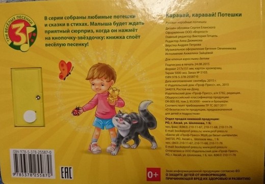 "Каравай, каравай" - это книга из серии "Три весёлых песенки" от издательства Проф-Пресс. Издания этой серии рассчитаны на самых маленьких читателей и отлично подходят для чтения взрослыми детям. Они не только содержат любимые стихи и потешки с красочными картинками, но и дополнены звуковым модулем с кнопками-звёздочками, по нажатию на которые малыш услышит весёлую песенку.