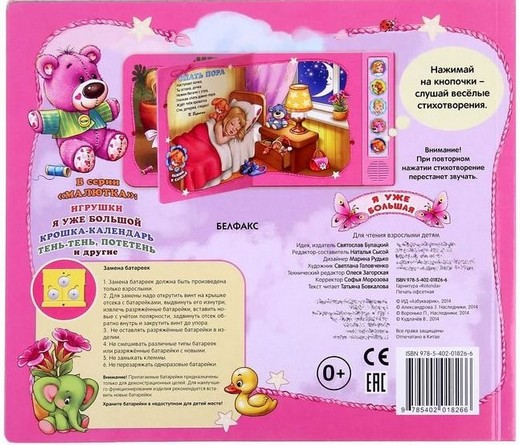 Разговаривающая книжка «Я уже большая» предназначена специально для маленьких девочек. В ней они найдут веселые и познавательные стишки, которые поведают много нового и интересного. Расскажут о веселых приключениях девочки Кати. А если ваша дочурка устанет читать, то стоит только нажать волшебную сенсорную кнопочку, как книжка оживет и заговорит. Стишки в ней простые и легко запоминаются. Эта увлекательная вещица скрасит ваш с ребенком досуг, доставит массу приятных впечатлений и станет любимой игрушкой для девочки.